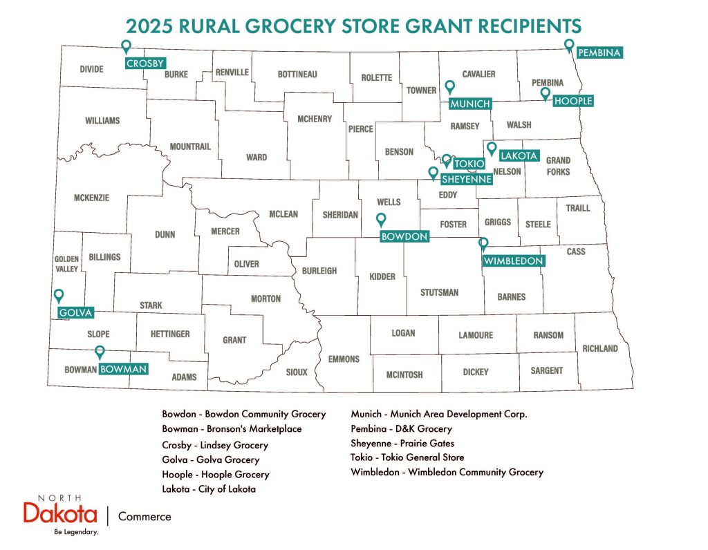 Three regional businesses have received the Rural Grocery Store Sustainability Grant from the North Dakota Department of Commerce, boosting local food access and collaboration across rural communities. This grant program is designed to support the sustainability of rural grocery stores, expand food co-ops, and enhance access to healthy, quality foods. $1 million dollars was appropriated by the 2025 Legislature.