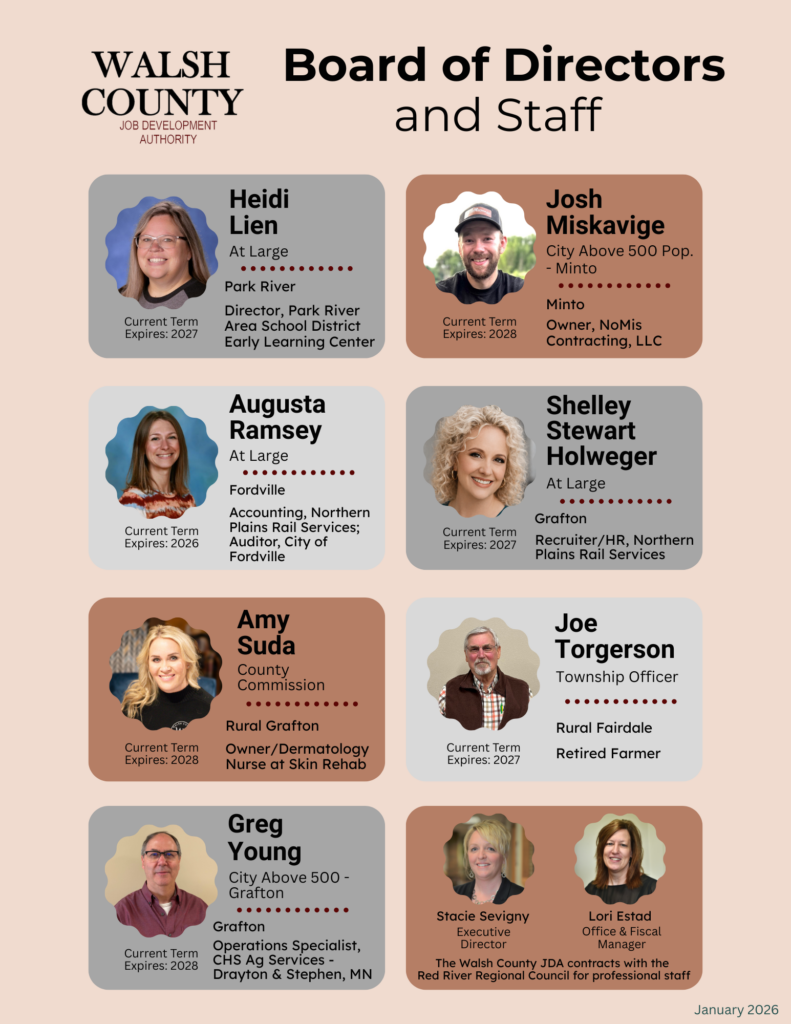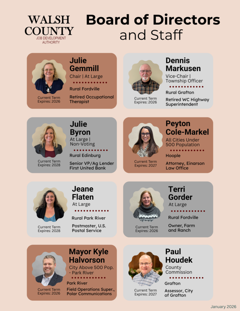 Behind every initiative is a dedicated Board of Directors, appointed by the Walsh County Commission. This 15-member board guides the organization’s work, reviews funding applications, and ensures investments deliver long-term benefits for the people of Walsh County. Members serve staggered three-year terms, offering a steady mix of experienced leadership and fresh perspectives.